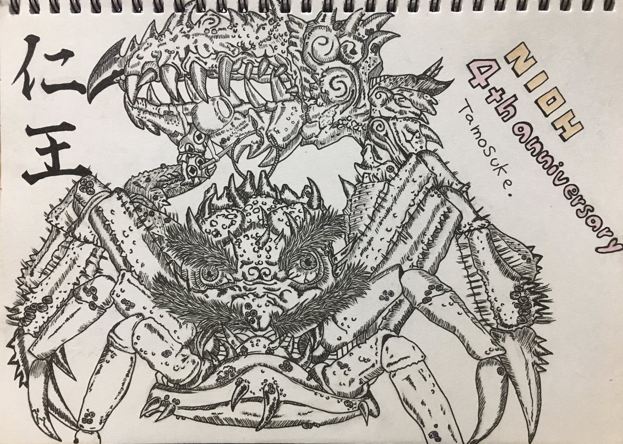 仁王4周年おめでとう! 化け蟹やっと完成しました。 本当に甲羅に顔みたいな模様付いた蟹が存在してたのは驚きました! 平家蟹って名前の蟹です。 #Nioh2 #仁王2 #nioh2art #仁王絵巻 #仁王シリーズ4周年