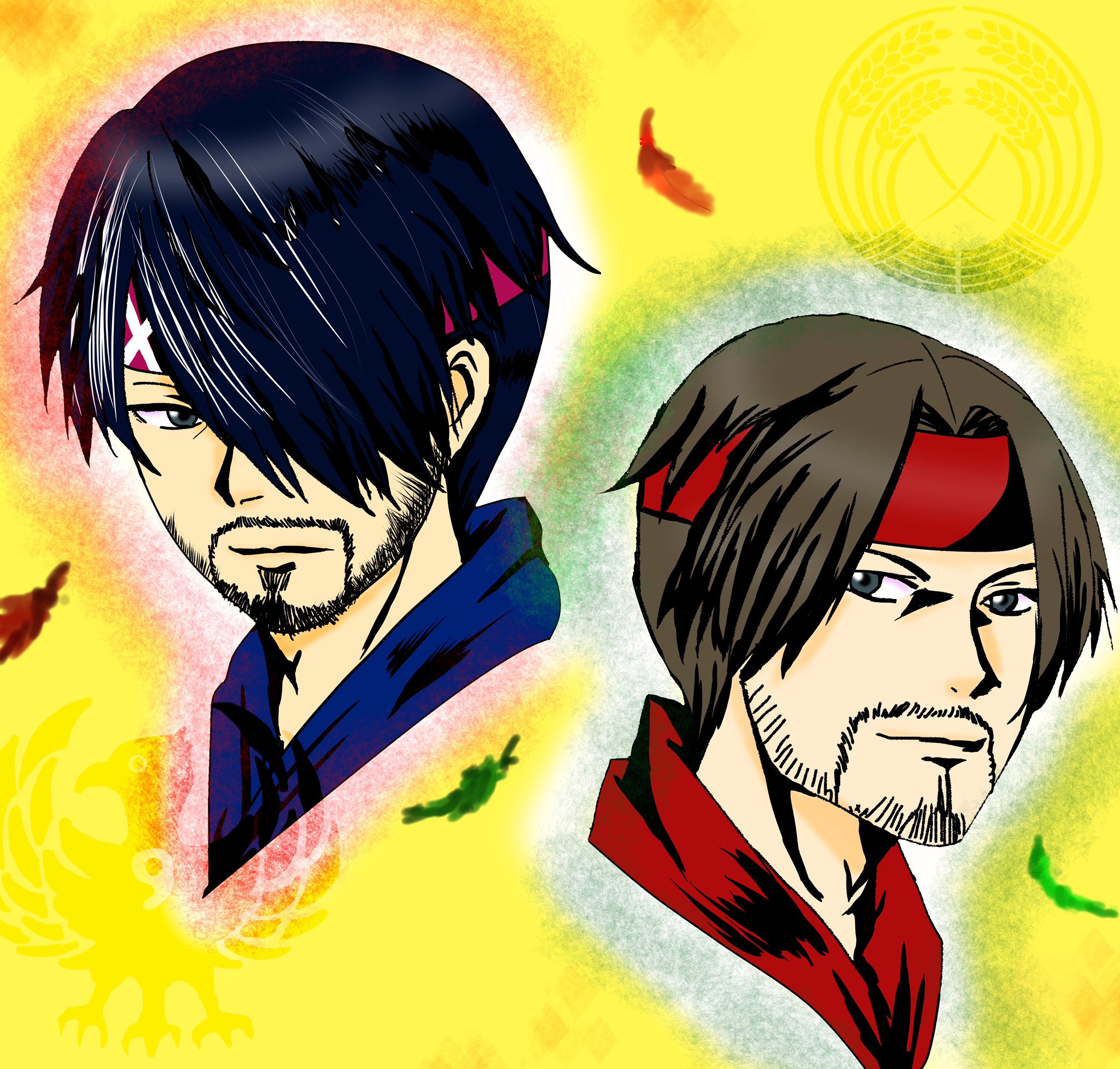 仁王にハマったきっかけは2代目孫一(見た目)、沼にハマり込まれたのは先代孫一。思い入れの2人を慣れないながらデジタルイラストでw 対照的な2人(戦場が火と水など)ですがどちらも魅力的!他にも魅力的な人物がいっぱいな仁王シリーズ 4周年おめでとうございます #仁王絵巻 #仁王シリーズ4周年