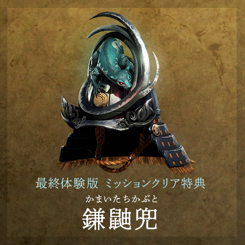 最終体験版の最初のミッションをクリアした方全員に、製品版で特別なアイテム「鎌鼬兜(かまいたちかぶと)」を入手できるダウンロードコンテンツ「討魔の証」を贈呈いたします。