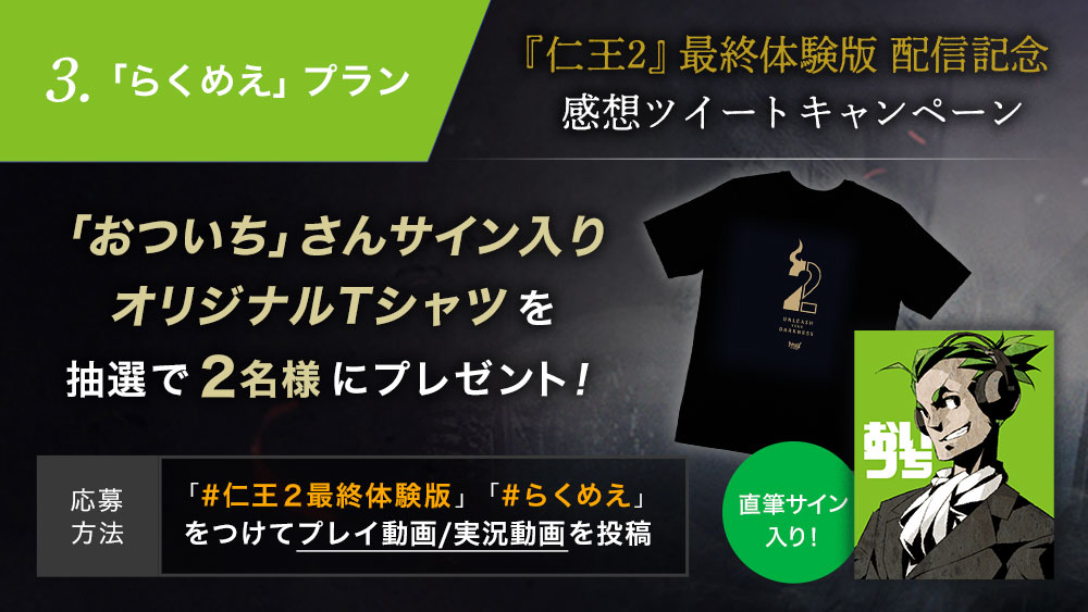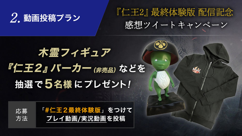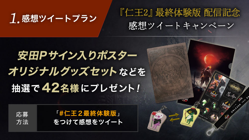 2020年2月28日(金)からの「『仁王2』最終体験版」の配信にあわせて、感想ツイートキャンペーンを実施いたします。他では手に入らない豪華景品を各種ご用意していますので、奮ってご応募ください。