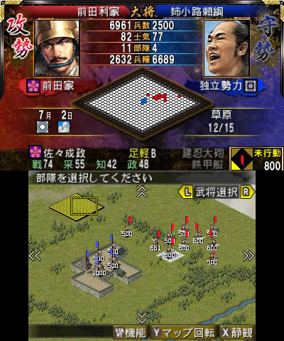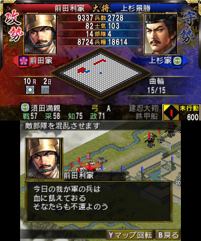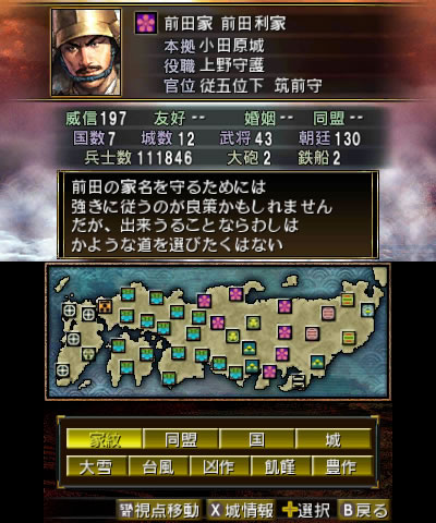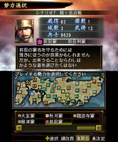 通常の「賤ヶ岳合戦」シナリオの場合、前田利家は柴田勝家の配下として加賀国の支城・七尾城に存在するため、大名としては選択できません。そのため、前田利家を大名としてプレイするため『信長の野望2』の機能である「新大名家の作成」を使用して前田家を新たに作成し、プレイ大名家に選択してスタートします。