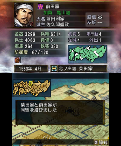 まずは柴田家と同盟を結んで後方の憂いをなくし、富国強兵に務めます。