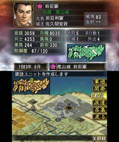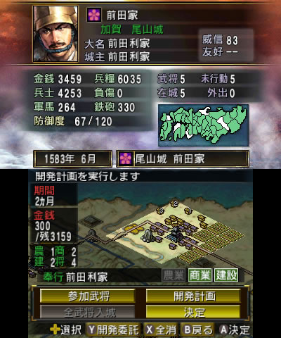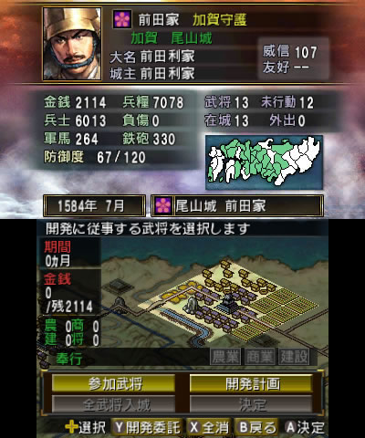 後方の安全は確保できたので、富国強兵に務めます。まずは本城の尾山城の開発を始めました。