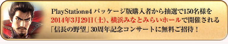 「信長の野望」シリーズで数々の楽曲を手掛ける山下康介さんを指揮者に迎えて、歴代「信長の野望」の名曲の数々を神奈川フィルハーモニー管弦楽団が奏でるオーケストラ・コンサートです。 『信長の野望・創造』テーマソング「Shine –未来へかざす火のように-」を唱う平原綾香さんと、 信長の野望30周年記念作品『下天の華』のオープニング曲を唱うグレース・マーヤさんがゲストで出演します。 ![]() ![]() ![]() ※本コンサートは完全招待制です。キャンペーン当選者へのご招待であり、チケットの販売予定はございません。