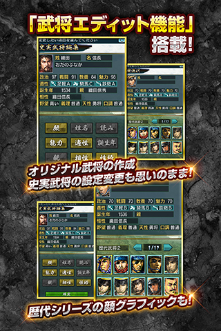 戦国時代の有名な逸話に基づいた数々の「歴史イベント」が発生する複数のシナリオ、初めてのプレイでも安心のチュートリアルなど、大満足のボリュームでお届けする『信長の野望』の決定版がスマートフォンで楽しめます。