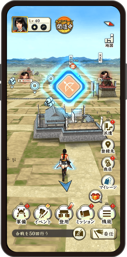 フィールドにはお城や施設、武将たちが登場し、あたかも戦国の世を歩いているかのような体験ができます。