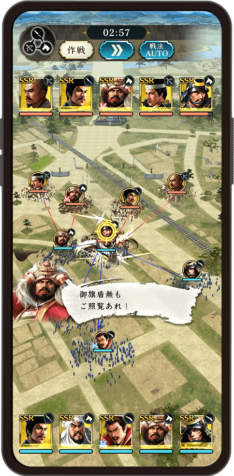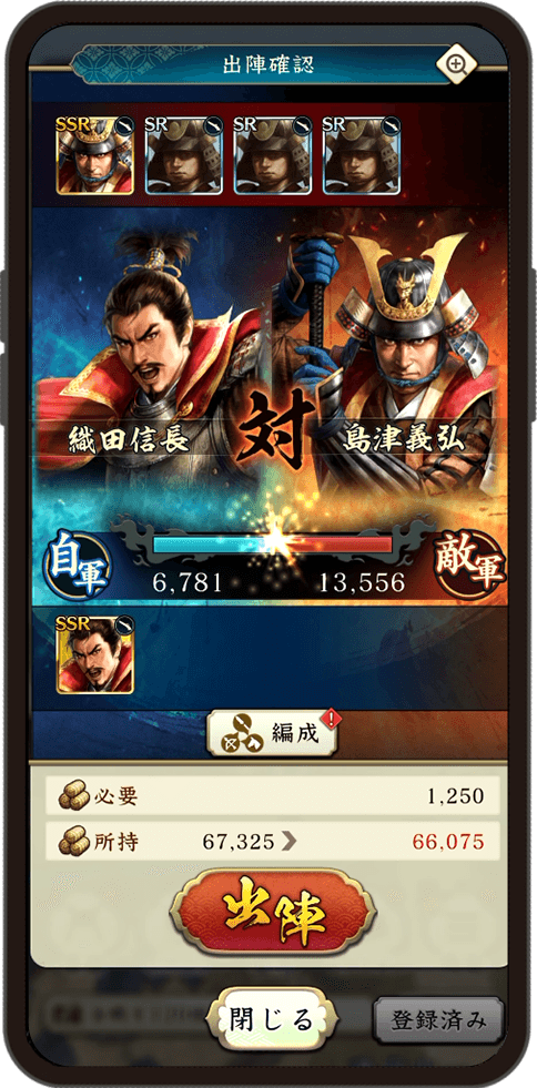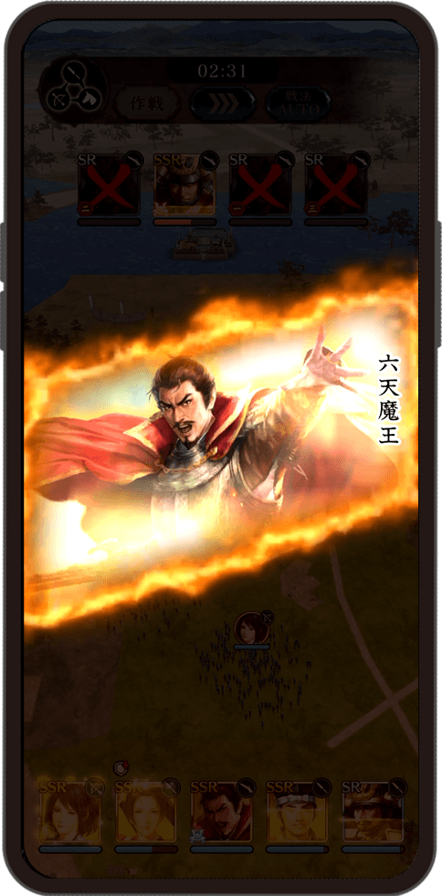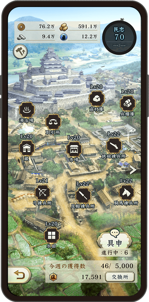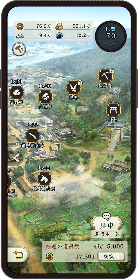 歩いて集めた資源を使い内政で国力を強化し、各地で集めた武将を育成し、自分だけの最強の軍団を編成しましょう。