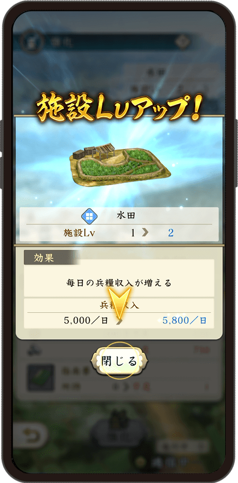 湯治場を開発すれば、武将との友好度を高め、武将の覚醒につなげることも。