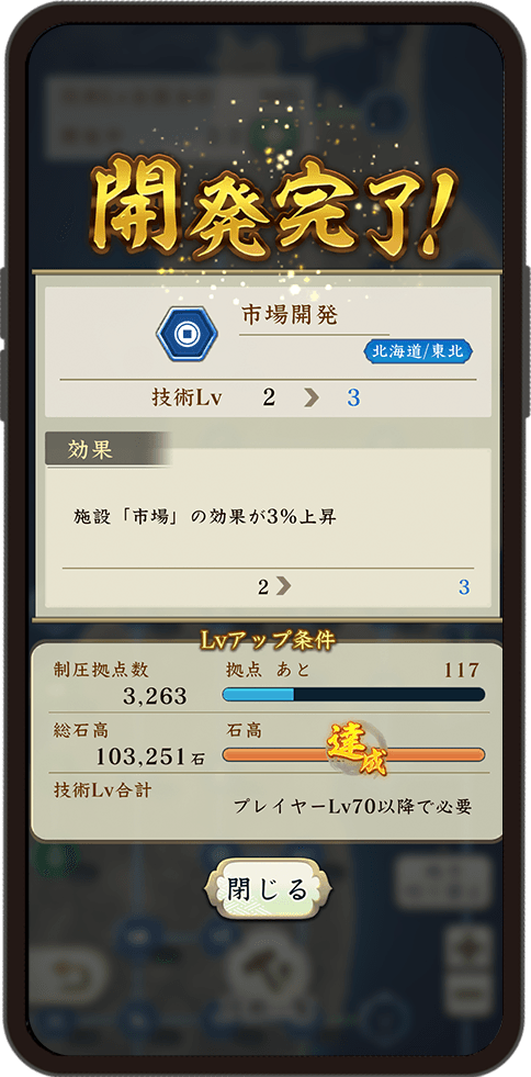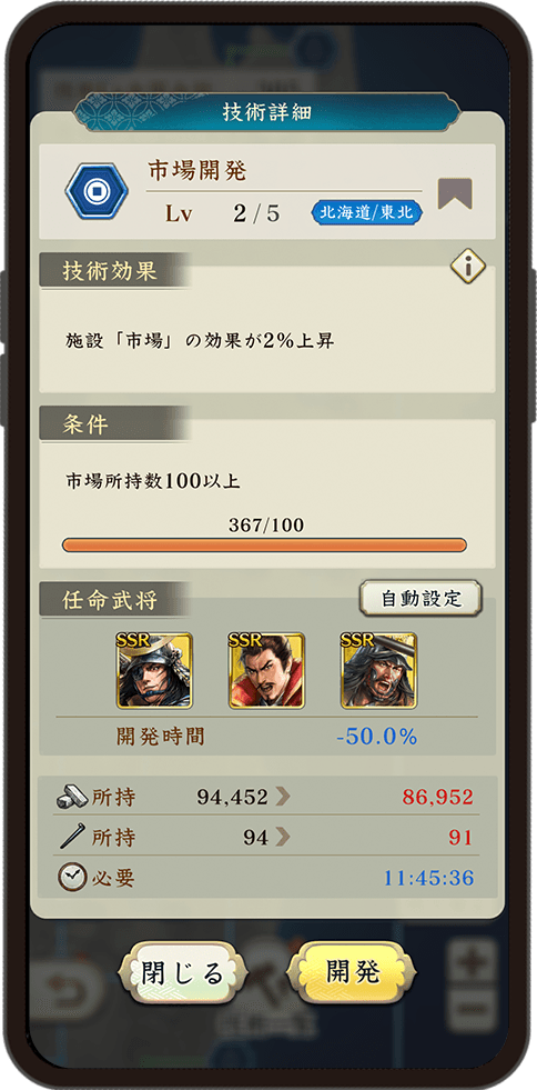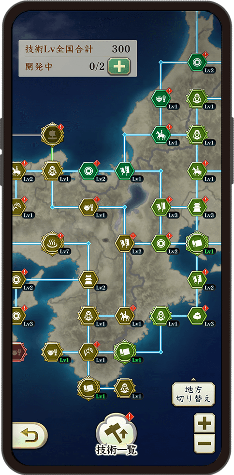 日本全国のさまざまな技術を開発し、自分の軍団の強化につなげられます。