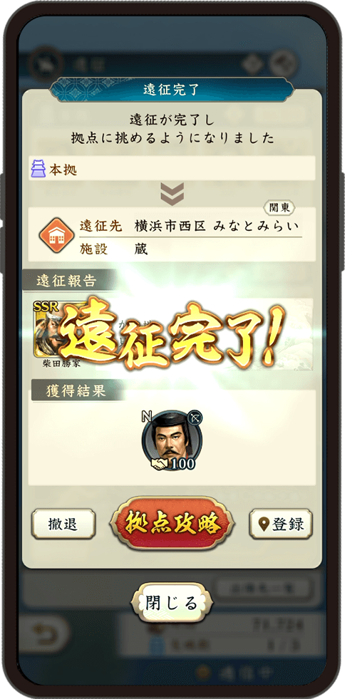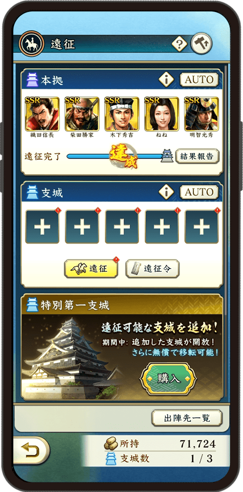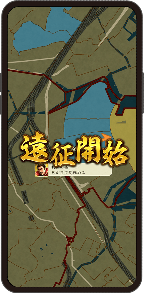 あらかじめ設置した「本城」や「支城」から隣接する区画に配下の武将を「遠征」させ、拠点戦に挑めます。