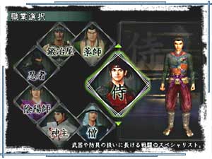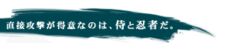 | 生命力で侍に劣るが、身軽で敵の攻撃があたりにくい。「火遁の術」や手裏剣が使える。敵陣へ忍び込めるのも、忍者の醍醐味だ。「神速の術」は日常生活に便利だったりする。 |
