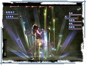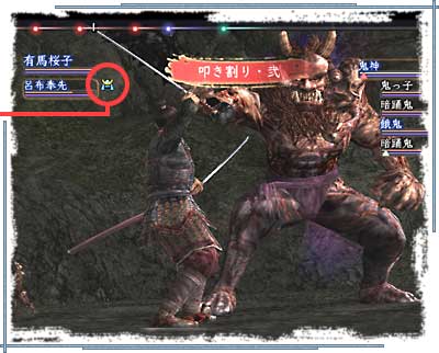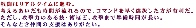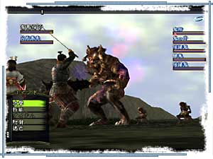 モンスター「鬼神」との戦い。他の雑魚もいるぞ。まとめて倒すには強力な攻撃術を使いたいところだ。 なお、徒党は最大7人まで組める。 7種すべての職業をそろえると強力なのだが、2人では少し心許ない。一番下の「逃亡」コマンドを使おうかな… 。