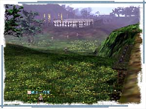 門の上から見回すと、右手に陣が見える。歩いてきたのが仲間NPCだから味方陣地なのだろうか?