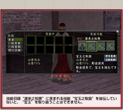 “宝玉”を取り扱うには、“南蛮街”で技能目録“渡来之知恵”を購入し、修得する必要があります。“宝玉”を鍛錬、使用するには、「破天の章」アカウントにアップグレードしていなければなりません。