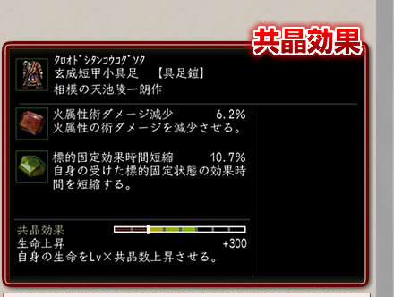 “宝玉”の効果はこれだけでなく、ある条件を満たすと、装備品に取り付けた“宝玉”全体で得られる“共晶効果”というものが発動します。共晶効果は絶大で、生命や気合を上昇させるもの、装備品の物理耐性や術耐性を上昇させるものなど、があります。ただし、共晶を成立させるには、多くの“チャレンジ”が必要となります。