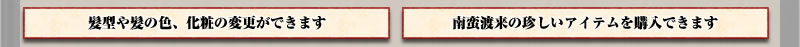“南蛮街”は堺の町の中からゾーン移動することで入場できます。“南蛮街”では化粧や髪型の変更ができたり、南蛮渡来の特殊なアイテムを購入できます。また“南蛮街”で発生するクエストも用意されています。