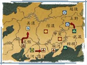 たとえば、那古野の織田家勢力なら、マップ上方の美濃へ向かいます。
