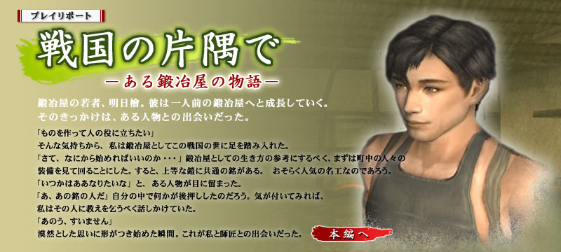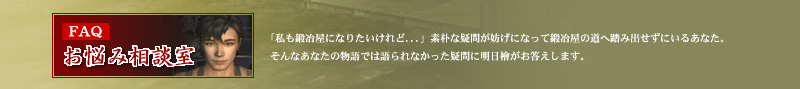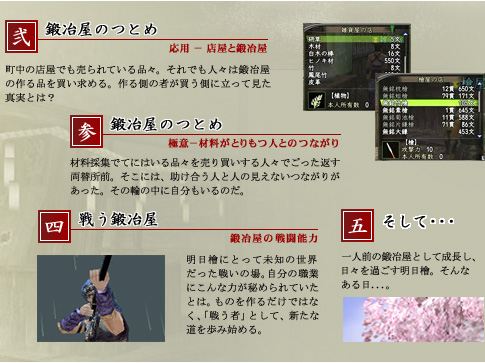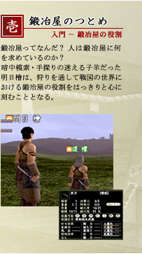 入門−鍛冶屋の役割 応用−店屋と鍛冶 極意−材料がとりもつ人とのつながり 戦う鍛冶屋 鍛冶屋の戦闘能力 そして・・・ お悩み相談室 本編へ