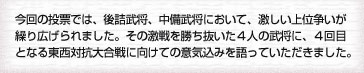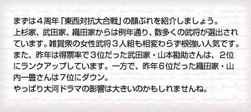 よろしくお願いします! 前回、前々回と2位だった竹中半兵衛さんを3位に下しての逆転劇でしたね。 |