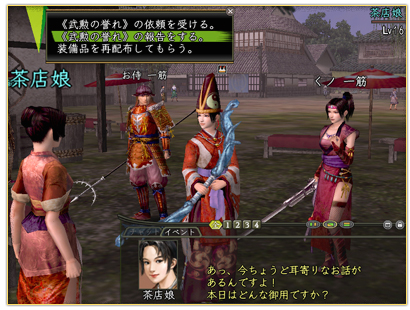 各町にいるNPC“茶店娘”から、依頼「武勲の誉れ」を受けてください。クエストを達成するとNPC“茶店娘”から、どこでも使える強力な装備品を期間限定で貸してもらえるようになります。