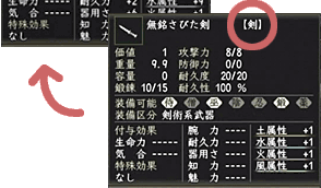 まずは、剣を手に入れるところからですね。「鋼の剣」や「段平」など、武器の種類が「剣」となっているアイテムが対象になります。他の武器は「七支刀」にすることができませんので注意してくださいね。誰かから買ったものでも、お店で買ったものでも、敵が落としたものでも、どれでもかまいません。