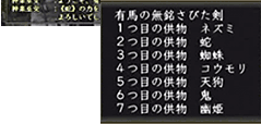 大事なのは「7種類」という点です。一度使った種類とは別の種類の供物でないと神楽巫女は受け付けてくれません。