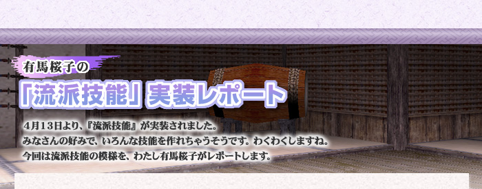 ![]() 戦闘中に行動を取ることによって、流派技能を成長させることができます。まれに、思わぬ成長をしてしまうことも……。 いろんな戦闘技能を使って、流派技能を成長させてみましょう。 どの戦闘技能で、どれほどの影響があらわれるのか……みなさんの手で確かめてくださいね! (※戦闘で成長させる時は、流派技能の『実装』を忘れずに。) |