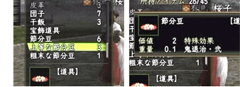 「アイテム」を「使用」するコマンドで豆を選ぶと、豆をまくことができます。ただし、その際にアイテムを使う対象として、鬼にターゲットを合わせておいてください。 |