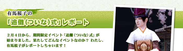 「追儺(ついな)式」とは? 那古野や甲府といった、大名家の本拠地がある町を歩き回ってみましたか? 町の中に5種類の鬼がうろついています。「節分の鬼女」「節分の小鬼」「節分の黒鬼」「節分の青鬼」「節分の赤鬼」の5つです。この鬼達を、豆をまいて町の外に追い出すのが、今回のイベント「追儺式」です。 ![]() |