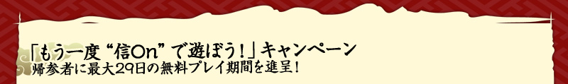 そこでプレイを中断されている方々が、気軽にご参加いただけるよう「もう一度“信On”で遊ぼう!」キャンペーンを開催いたします。帰参対象者には、最大29日間の無料プレイ期間を進呈するほか、役立つ特典もご用意しました。この機会に再度“戦国生活”をお楽しみいただければと思います。