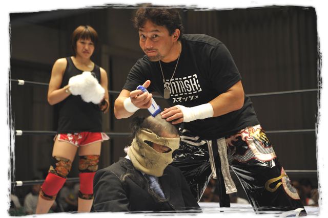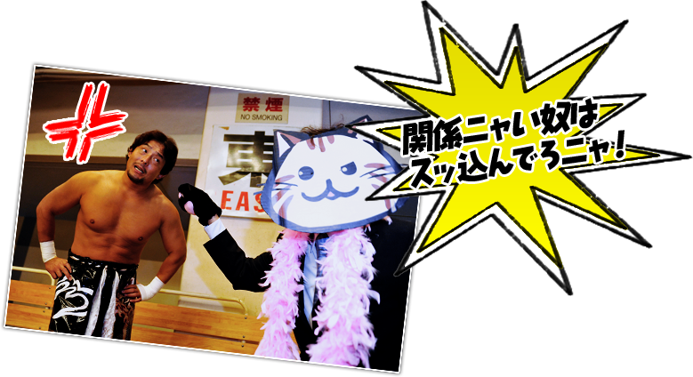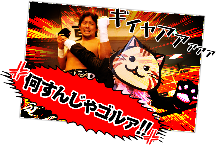 ニャラキは強制的に引き起こされ、TAJIRI選手にバリバリと頭を刈り上げられていくのでした。めでたしめでたし。