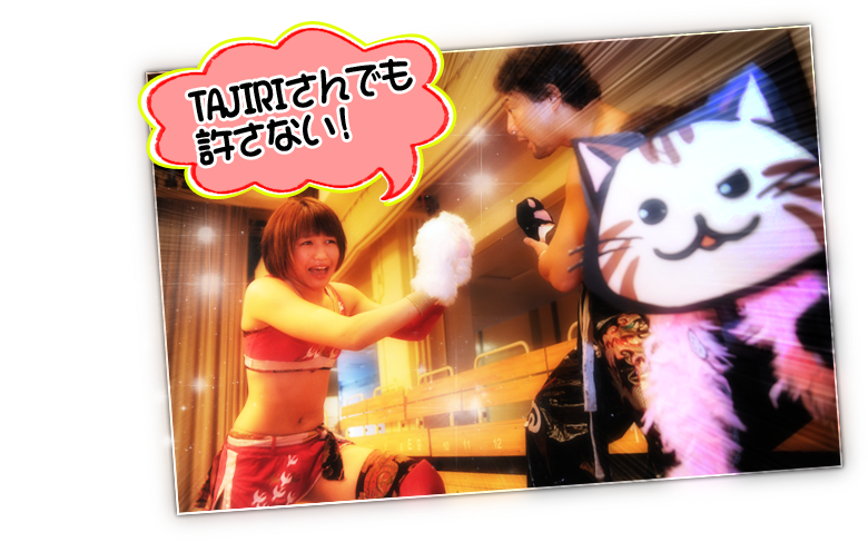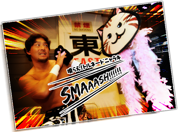 最後の抵抗を試みるニャラキでしたが、TAJIRI選手のミドルキックがお尻に炸裂し、あえなくダウン!