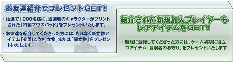 お友達をご紹介してくれた方には、もれなく装備アイテム「紹介の証」と、立物アイテム「交叉(こうさ)立物」または「扇立物」を、ご紹介された新規プレイヤーの方には、もれなく装備アイテム「冒険者のお守り」を進呈いたします。 |