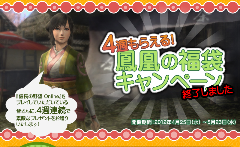 第一週 2012年4月25日(水) 定期メンテナンス終了時(13:30予定) 〜 5月2日(水) 定期メンテナンス開始時(10:30予定) |