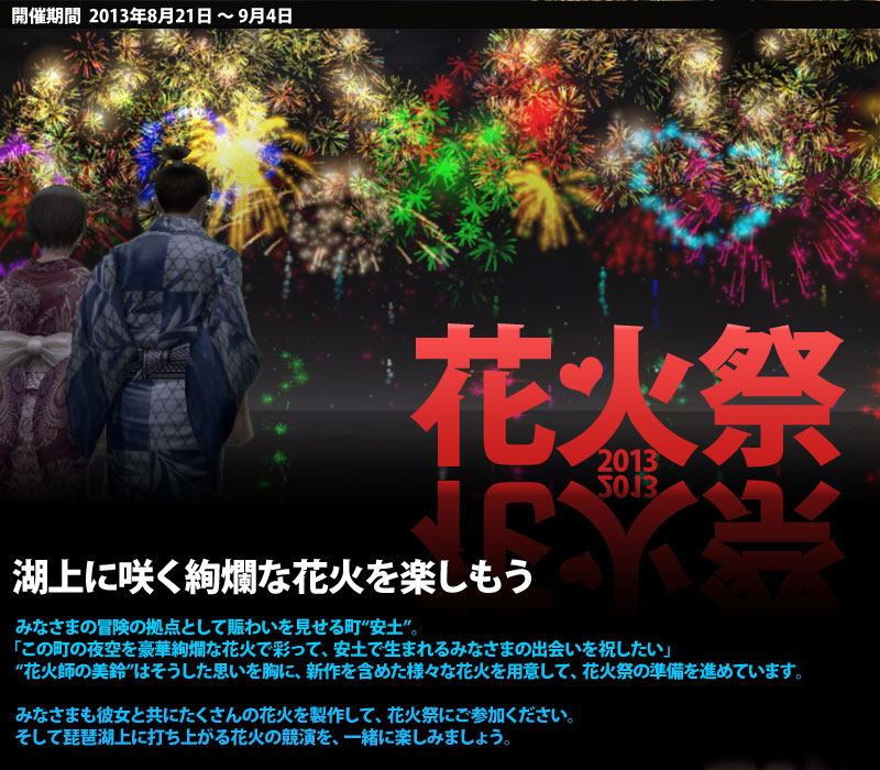 「花火祭2013」開催中、安土で花火大会を行います。ここでしか見られない花火もありますので、みなさまお誘い合わせの上、遊びにいらしてください。