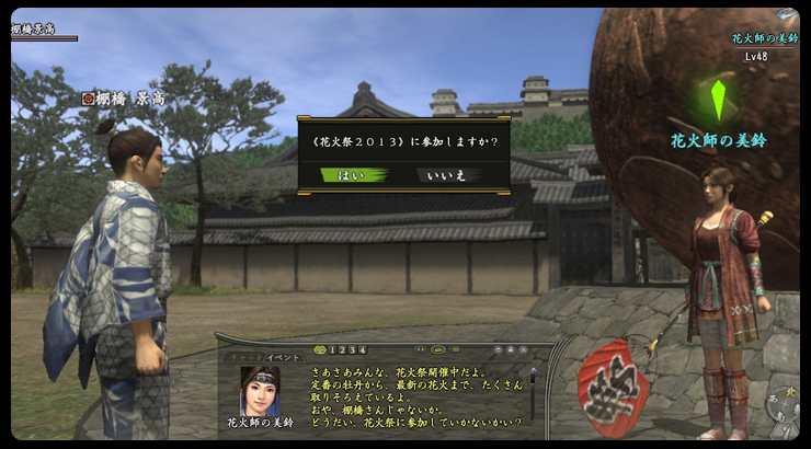 まずは安土にいるNPC“花火師の美鈴”(はなびしのみすず)に話し掛け、「花火祭2013」に参加します。