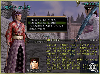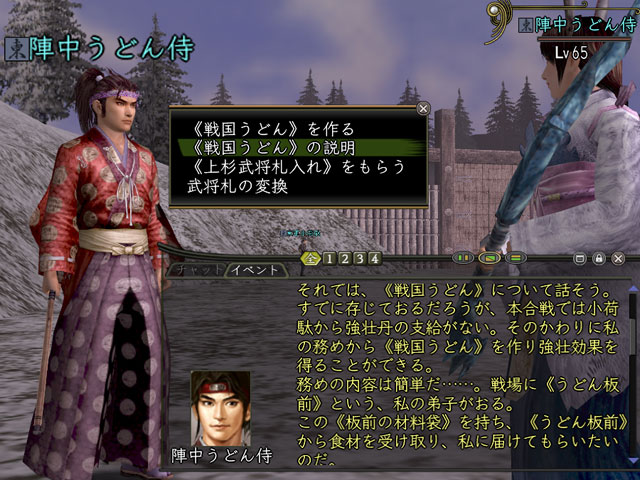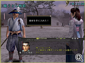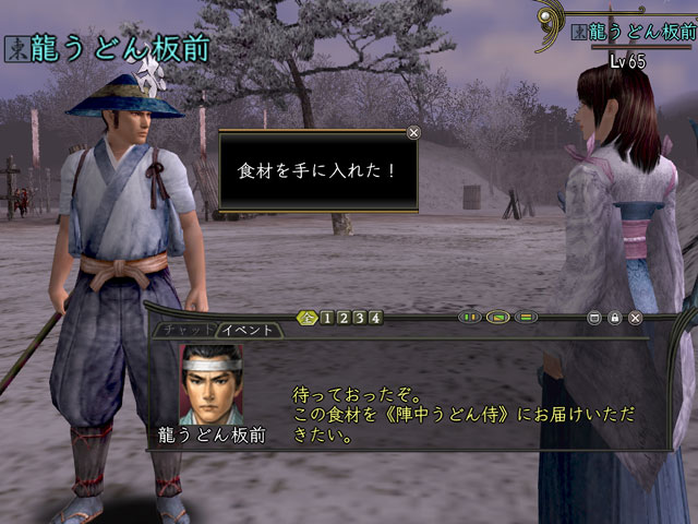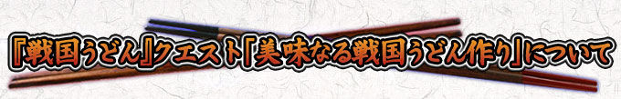 おいしいうどんを食べてパワーアップ! 合戦場でひと暴れしてきましょう!! 1.各合戦場の門外にいるNPC“陣中うどん侍”に話し掛けるとクエスト「美味なる戦国うどん作り」を依頼されます(依頼は何度でも受けられます)。