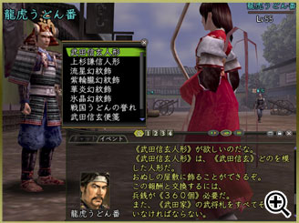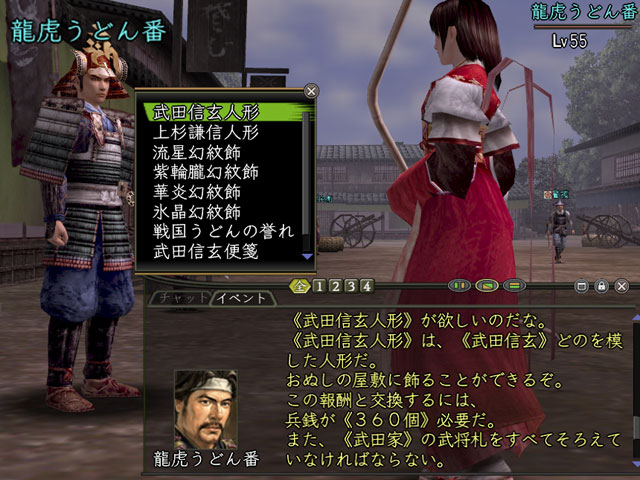 合戦場で敵兵を倒した際や、『戦国うどん』クエスト「美味なる戦国うどん作り」の達成時に《兵銭》が手に入ります。この《兵銭》を集めて、NPC“龍虎うどん番”に渡すことで、武家屋敷に飾れる《上杉謙信人形》や《武田信玄人形》を始め、様々な報酬を入手できます。