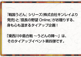 “東西合戦”に則した内容となっています(参考)。プレイヤーが東西両軍に分かれて“陣取戦”を行い、勝敗を競います。 ※タイアップイベントには、株式会社キンレイより発売中の「戦国うどん」シリーズをモチーフにした食材やうどんが登場しますが、 実際の商品とは食材や味付けなど、一部異なる場合がございます。 2010年1月20日(水) 定期メンテナンス終了後(13:30予定) 〜 2月3日(水) 定期メンテンス開始時(7:30予定)