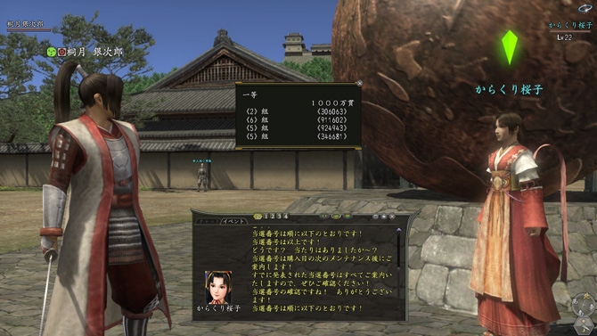“安土”の地球儀前にいるNPC“からくり桜子”から、《富くじ》を1口10貫で購入できます。富くじは開催期間中、全2回発売され、発売回ごとに1プレイヤーキャラクターあたり最大200口まで購入できます。また「秋の大富くじ」に参加したプレイヤーキャラクターには、発売回ごとに5口分の富くじをプレゼントします。