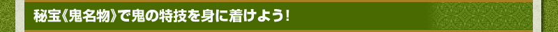 桃太郎砦に眠る伝説の秘宝《鬼名物》は、葛篭箱からまれに発見できます。《鬼名物》を所持した者は光り輝く姿となり、鬼の特技を使用できるようになります。《鬼名物》は複数の種類があり、それぞれ使用できる特技が異なります。