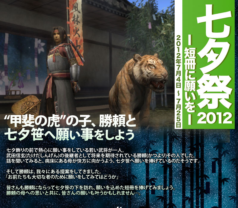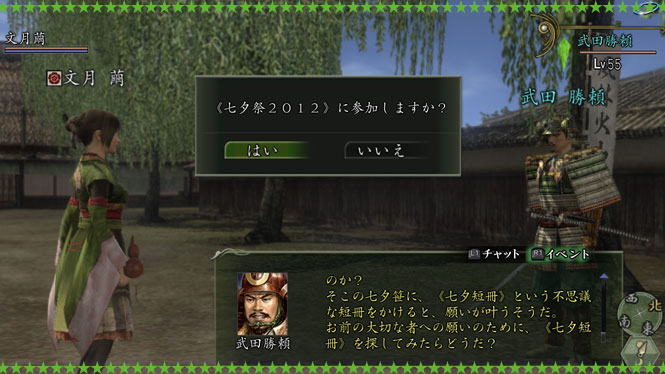“隠れ里”の入り口付近にいるNPC“武田勝頼”から「七夕祭2012」に参加できます。
