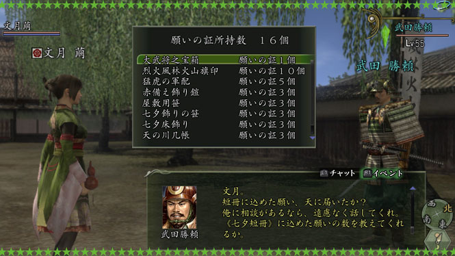 《願いの証》を集めたら、勝頼のところへ行ってみましょう。貴重なアイテムが入っている宝箱や、七夕にちなんだ家具、武田家ゆかりの品、虎に変身できる軍配など、様々な報酬と交換してくれます。