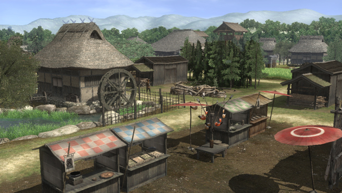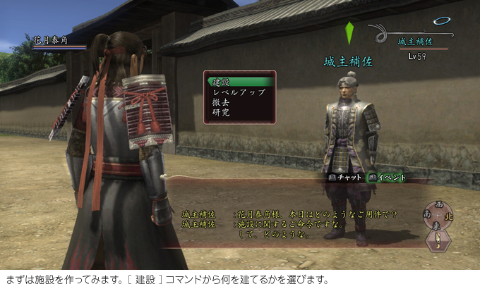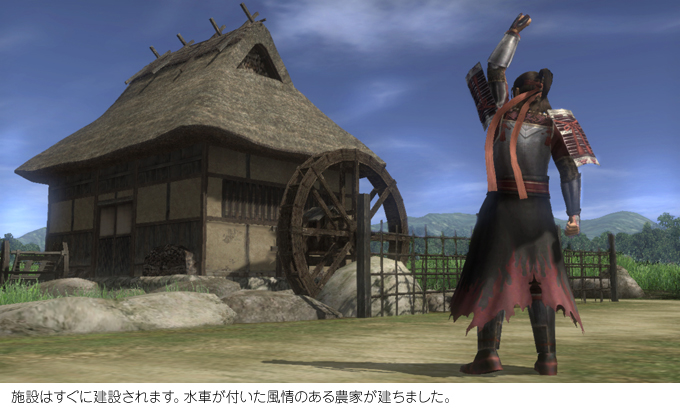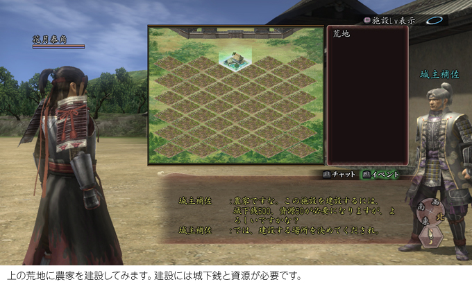 「鳳凰の章」では、プレイヤーの皆さんが城下町を1つ所有できます。城下町は、最初は何もない空き地のような場所。そこに様々な施設を建設して、町を整備していきます。そして町から上がる収入を投入し、さらに町を発展させる。こうして、思い思いの城下町を生み出せます。