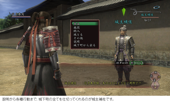 城下町に移動したら、NPC“城主補佐”に話し掛けましょう。彼が城下町の一切をとり仕切ってくれます。