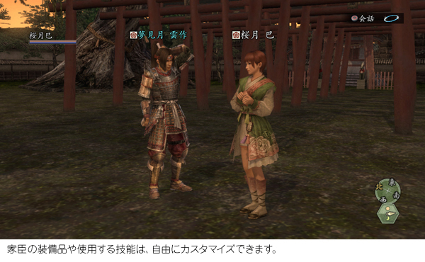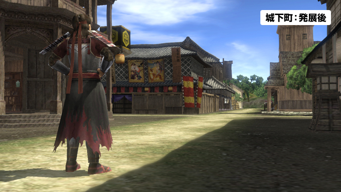 城下町はプレイヤーキャラクターを操作して探索でき、自分の町だけでなくワールドの枠を越えて、他のプレイヤーの城下町も訪問できます。また城下町は、「鳳凰の章」にてプレイヤーの配下となる“家臣団”の育成の場としても活用できます。