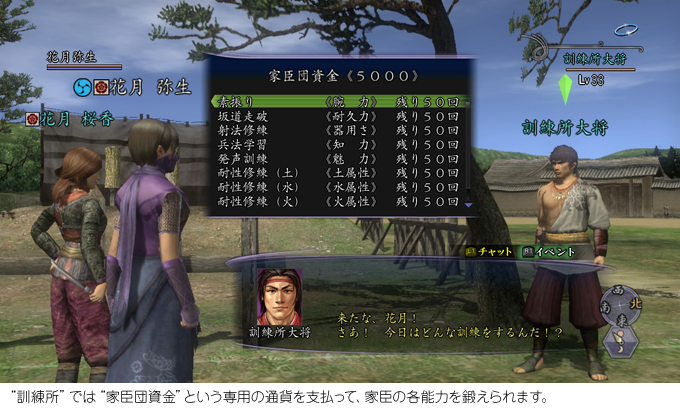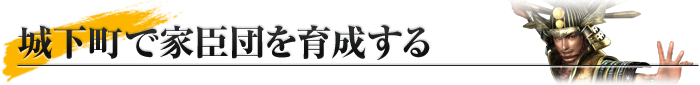 城下町の施設の中には、家臣団を育成できる施設があります。そこでは、生命力や気合、能力などを鍛えて、家臣をレベルアップできます。また、家臣の装備品を購入できる施設もあります。