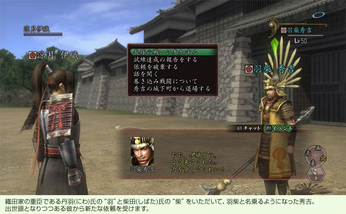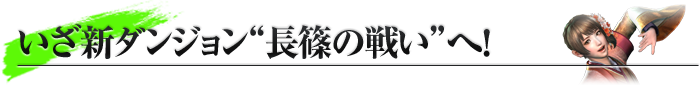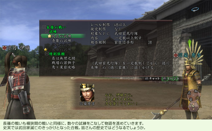 “秀吉の城下町”へ移動すると、長浜(ながはま)城主となった秀吉が出迎えてくれます。彼に話し掛け、[ 長篠の戦いに参加する ]を選ぶと試練の一覧が表示されるので、まずは“脱出の試練”に挑戦してみましょう。