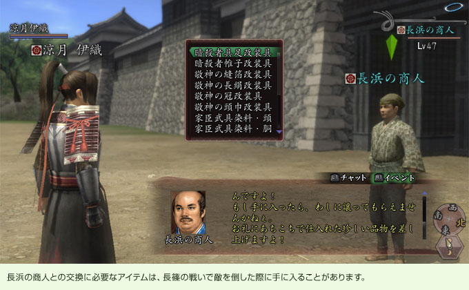 まずは長篠の戦いの報酬として、改装具と家臣用アイテムを追加します。NPC“長浜の商人”(ながはまのしょうにん)と交換して手に入れてください。また、桶狭間の戦いにも報酬を追加。異なるアイテム種類であっても仕立て直せる改装具と家臣用アイテムが登場します。こちらはNPC“中村の商人”(なかむらのしょうにん)と交換してください。