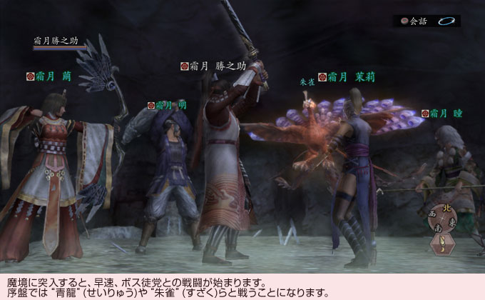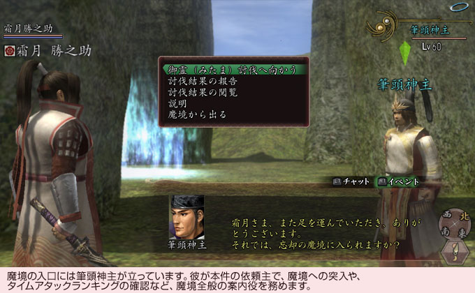入口にいる筆頭神主と話すと、いよいよ魔境への挑戦が始まります。魔境は複数の区域から成っていて、各区域には5体ずつボス徒党が存在します。ボス徒党は『信長の野望 Online』オールキャストといった陣容で、懐かしい強敵たちがずらりと並んでいます。